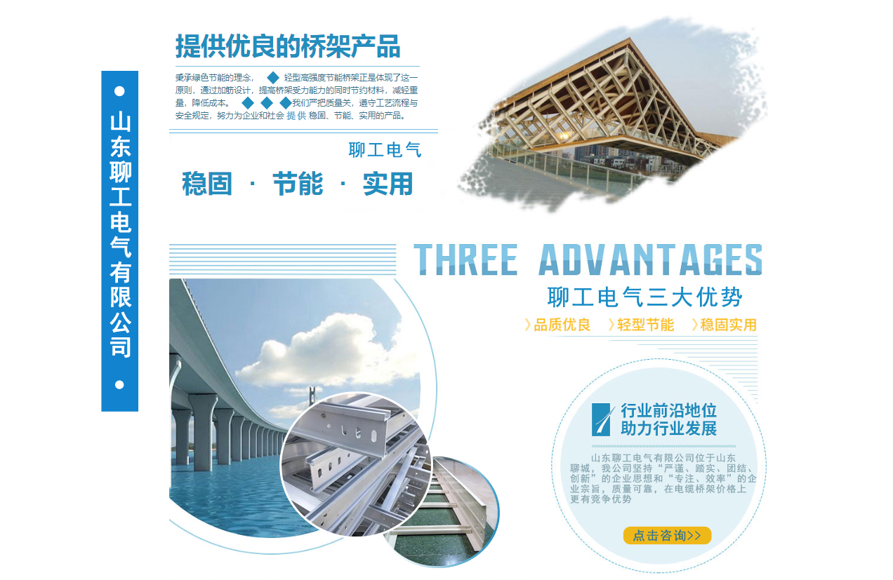 山東聊工電氣有限公司位于山東聊城,是一家銷售各類橋架的公司,公司主營鍍鋅防火噴塑橋架,鍍鋅防火電纜橋架 ,不銹鋼電纜橋架,熱浸鋅電纜橋架,鋁合金電纜橋架,熱鍍鋅電纜橋架,梯式電纜橋架等我公司堅持“嚴謹、踏實、團結、創新”的企業思想和“專注、效率”的企業宗旨,質量可靠,在電纜橋架價格上更有競爭優勢。公司追求品質,配有研發人員,進行產品的改革和創新,服務先進走出了一條富有企業特色的可持續化發展之路! 我公司鄭重向你承諾:保證最好的質量,以低的價格,完善的售后服務,來答謝新老客戶??商崆半娫捖撓怠?..